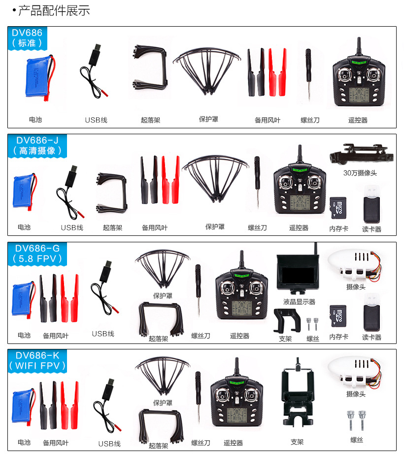产品附带配件明细:飞行器*1、遥控器*1、、锂电池*1、充电器*1、风叶*4、说明书*1、彩盒包装*1