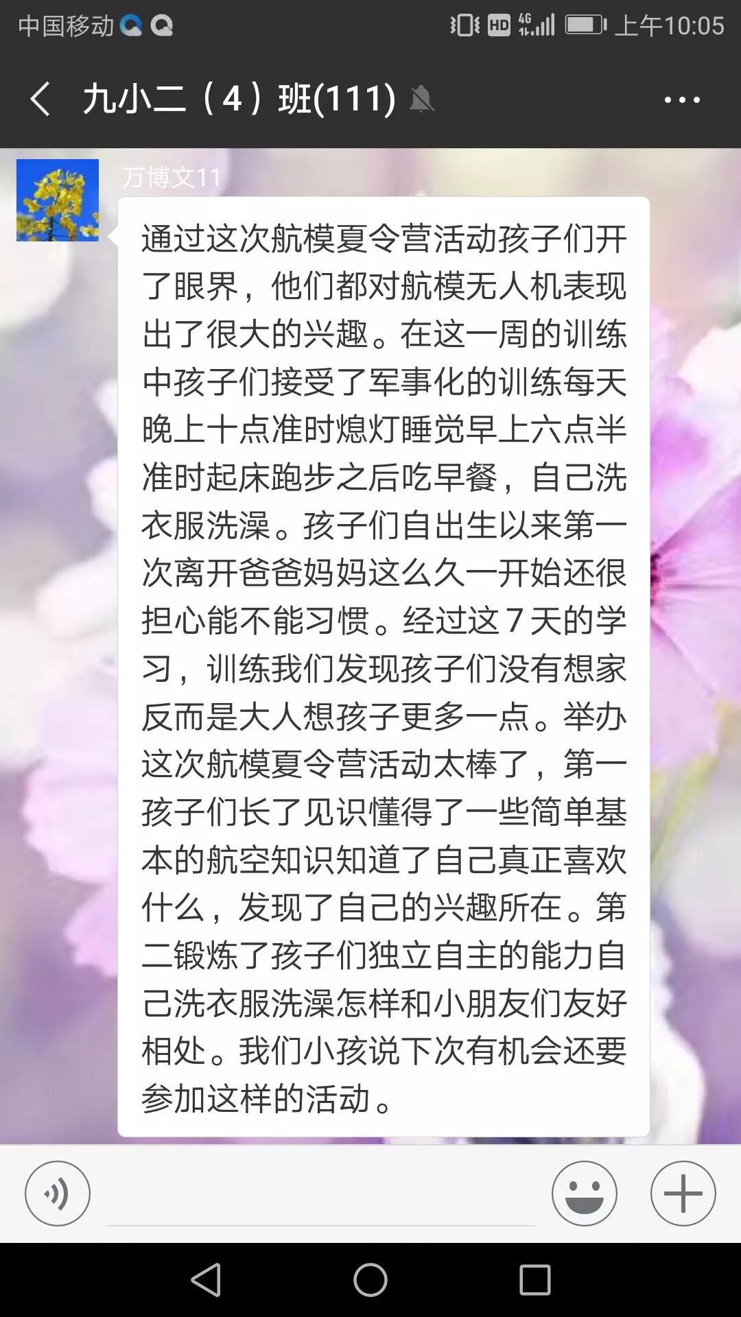通过这几天的军事化学习,我也能独立生活做很多事了,以后就不需要爸爸妈妈帮 我了。也学到了很多课本上没有的知识,也交了好多好朋友。最关键的是我也会飞无人机了,以后,我就可以和爸爸妈妈、妹妹一起去师范学院的草坪上尽情的放飞我的梦想了。