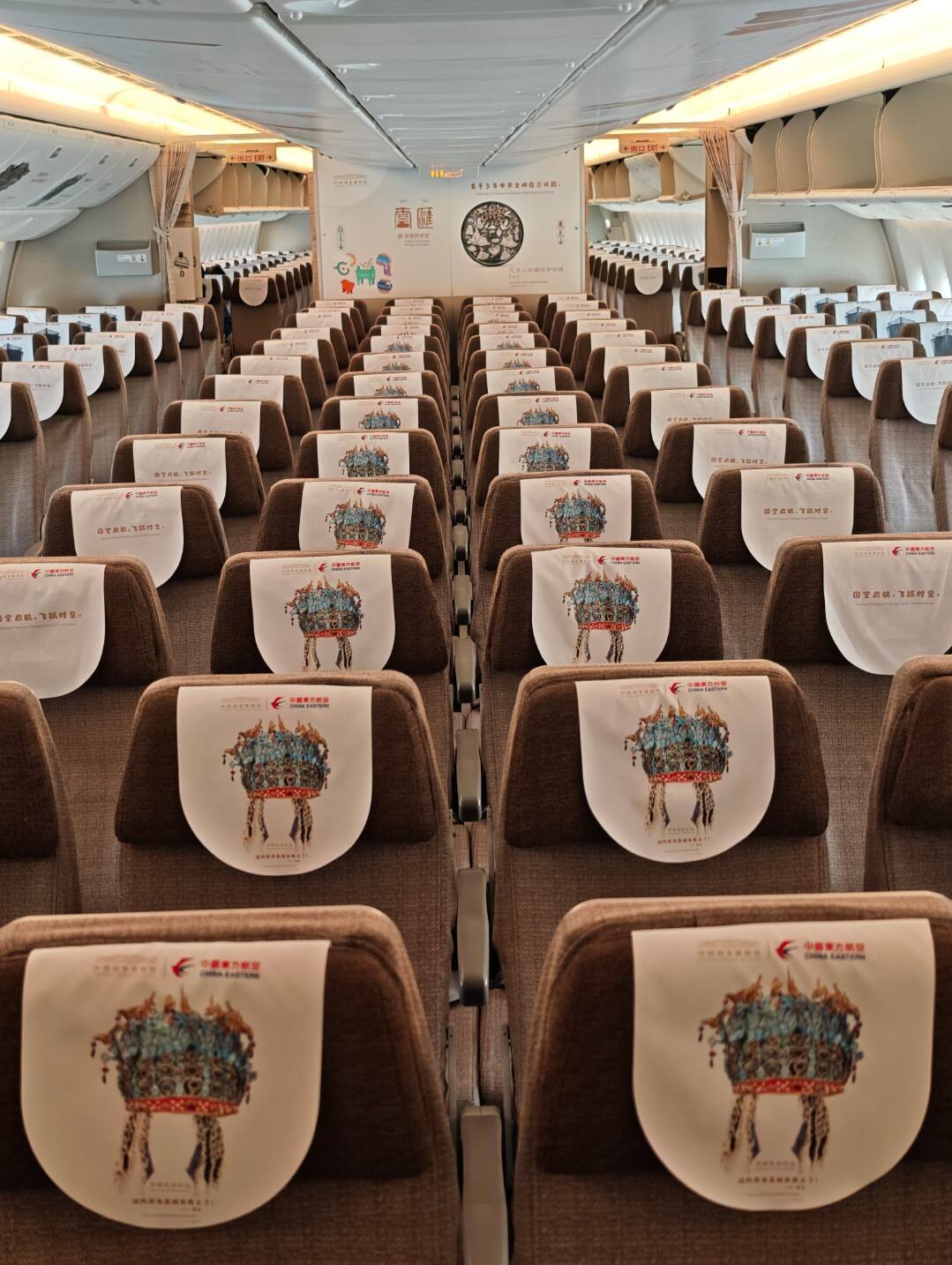 东航“国博号”主题彩绘机被称为是国博48个标准展厅之外的“第49个展厅”。客舱内,近70米长的行李架与舱壁上,按时间顺序贴绘了国家博物馆精选的近50件馆藏文物,清晰勾勒出中华文明历史脉络。座椅头枕巾特别设计了凤冠、东坡巾等样式,旅客入座后即可体验“凤冠霞帔或是羽扇纶巾”的古风意趣,打卡合影,便是一场有温度的文化互动。