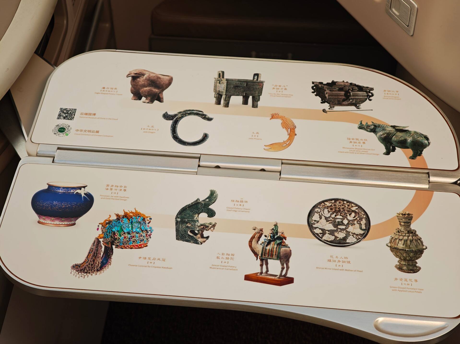 “国博号”还打造了便于文化传播的交互型飞机客舱。通过东航“全程在线”的空中Wi-Fi功能,旅客使用AI软件“豆包”扫描客舱行李架或小桌板上的文物图案,便可实时收听专业讲解。客舱内二维码聚合了“中华文明云展”,链接起国博“古代中国”基本陈列的数字孪生空间,真正实现了无预约、免排队,在万米高空沉浸式“逛国博”。客舱还配备了《人民画报》国博特刊,其中收录了国博“古代中国”基本陈列百件瑰宝精美图片,让旅客在旅途中能深度品读中华文明。