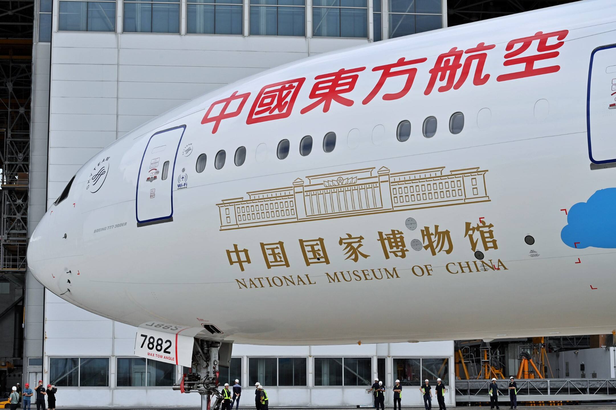 东航“国博号”主题彩绘机编号为B-7882,由B777-300ER大型宽体客机打造而成。机身采用“双面全机身彩绘”方案,从143万余件国博馆藏珍品中遴选出“玉龙、玉凤、鹰形陶鼎、‘后母戊’青铜方鼎、孝端皇后凤冠和霁青釉金彩海晏河清尊”等6件横跨五千多年历史的文物作为主视觉元素喷绘上机。其中,商代“后母戊”青铜方鼎坐镇机身中部,尽显庄严稳重,寓意“起落安妥”;玉龙玉凤组合位于机翼前方,寓意“龙凤呈祥、旅途平安”;机尾处的海晏河清尊端庄典雅,与东航“小燕子”标识灵动活泼的风格相映成趣。国博金字Logo置于机身C位,醒目彰显“空中博物馆”的独特身份,让这架彩绘机成为传播中华文明的“空中名片”。