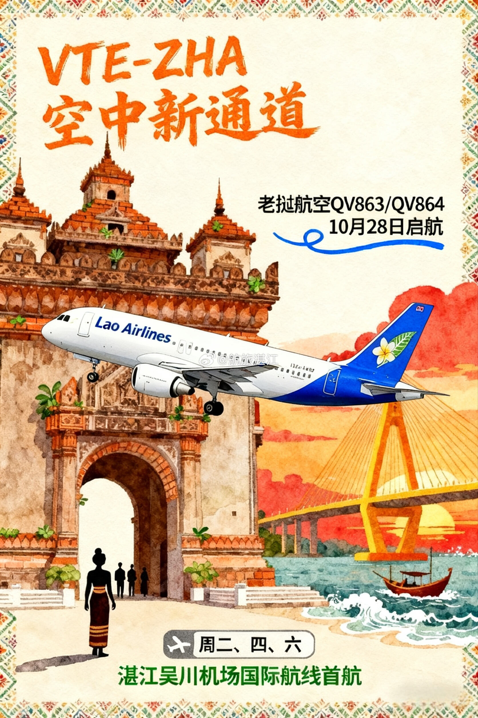 湛江吴川国际机场计划2025年10月28日首开湛江=万象(瓦岱)航线,执飞航司:老挝航空(Lao Airlines),航班号:QV863/64,时刻:万象(瓦岱)16:40-19:15湛江/湛江20:15-20:55万象(瓦岱),执飞机型:空中客车 A320,班期:每周二、四、六。