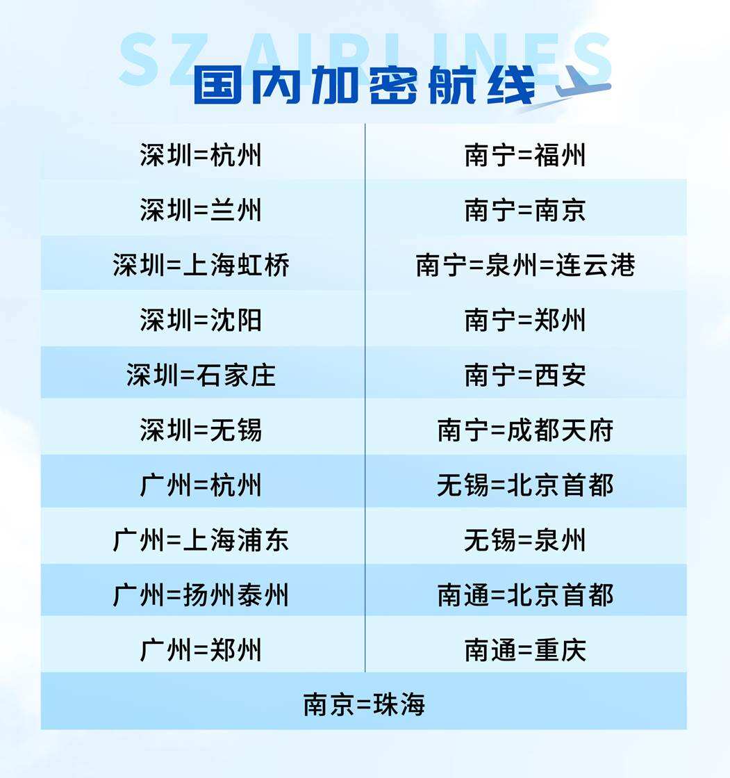 深圳航空(以下简称“深航”)将于10月26日正式启动2025冬春航季航班计划,以“焕新航季 畅飞世界”为主题,新增、加密37条国内航线,用更便捷的时刻与更优质的服务,为旅客打造冬春出行新选择。本航季深航持续升级国际枢纽航线网络,提升国内热门航线运力,让每一段旅程兼具效率与温度。