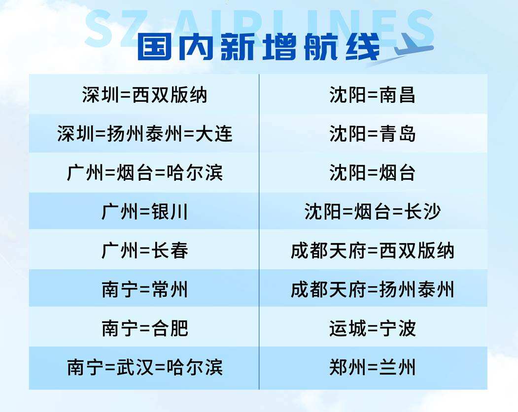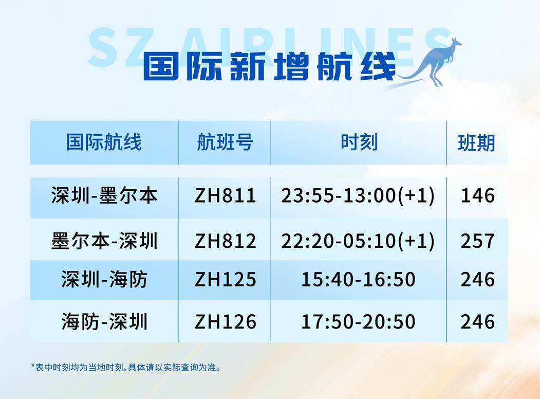 国际航线方面,深航首次开通深圳直飞澳大利亚墨尔本航线,该航线将于12月22日正式启航并采用空客A330宽体客机执飞,同时新增深圳-海防航线,目前国际航线网络已覆盖多哈、伦敦、巴塞罗那、曼谷、吉隆坡、金边等19个城市,持续助力深圳国际航空枢纽建设;国内航线方面,为精准匹配冬春旅游与公商务出行需求,新增深圳=西双版纳、深圳=大连,南宁=武汉=哈尔滨、南宁=合肥、南宁=常州,成都=西双版纳、成都=海口、成都=哈尔滨、成都=武汉,沈阳=达州等16条国内航线,并加密深圳=郑州、深圳=银川、深圳=石家庄、深圳=沈阳,广州=海口,成都=南通等21条热门航线班次;港澳台地区航线覆盖也持续完善,深航将继续执飞香港=无锡、香港=成都,澳门=无锡、澳门=南京,台北=深圳等航线,为旅客提供稳定高效的出行选择。